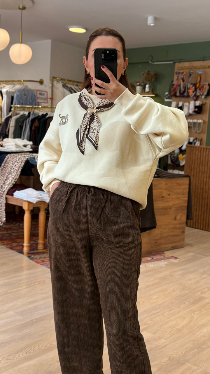 Yeni sezonun en trend parçalarından biriyle tanışın! Kendinden fularlı tasarımı ile farklılık yaratan bu sweatshirt, hem şıklığı hem de rahatlığı bir arada sunuyor. Oversize kalıbı sayesinde özgürce hareket etmenizi sağlarken, yumuşacık pamuk kumaşı ve şardonlu dokusu ile gün boyu konforu garantiliyor.