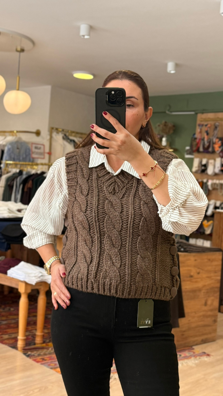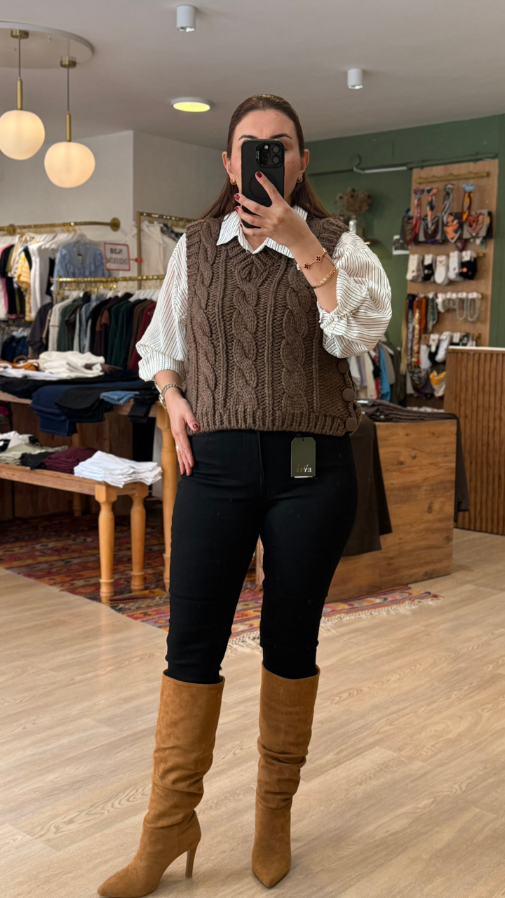 Yün dokusunun verdiği yumuşaklıkla hem tarzınızı hem konforunuzu bir adım öne taşıyan bu triko yelek, sezonun vazgeçilmez parçası olacak.